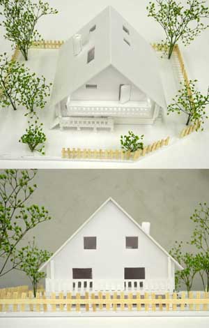 雪が多い所の建物ですので、屋根は10寸勾配の傾斜の大きい屋根にして、雪が落ちるようにしています。模型では表せていませんが、屋根の仕上げ材はウッドシングルを使い、壁は丸太を組んだものです。