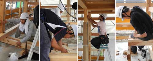 隣の敷地で共用トイレの工事が始まりました。プロの大工たちがプレカット材を次から次へと組み立てて行きます。1日でほとんど建て方が終わってしまいました。何と早いこと!時折、大工さんたちが物珍しそうに、こちらの学生たちの作業を覗いています。