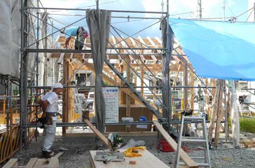 屋根作業班が断熱材の上から透湿防水シートをさっさと張っています。盆過ぎて、まだまだ暑い夏の空ですね〜。そして野地板を張って行きます。屋根に置かれた野地板が太陽の熱でねじ曲がっていきます。それを2人がかりで押えて、釘を打って留めます。野地板を打つのに2日かかりました。