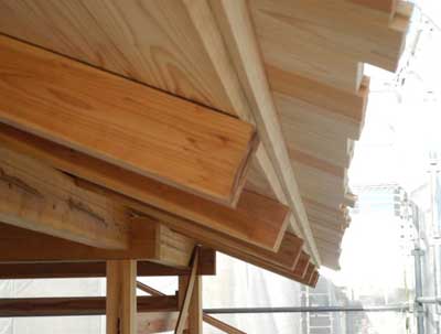 軒端には、1寸板を流して軒を伸ばしています。堂宮の裏甲(うらごう)のようなものですね。表は白い杉を集め揃えたので、裏は赤い杉となりました。サノ先生は2寸にと言ってますが、もう少し伸ばしてもいいように思えて、3寸まで伸ばせるようにしました。