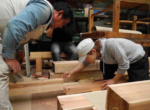 木工チームのナカハタです。町家を丸ごと一棟つくれるなんて、すごいと思って頑張ってます。頑張れば上手くなるのが自分の目にも見えて来るので、嬉しくなります。木工チームは14名いて、タダ先輩が棟梁として指導してくれるほかに、組合の若手勉強会の「葭塾」(よしじゅく)の福井塾長がじきじきに指導してくれるとあって、すごく充実しています。この日も金輪継ぎのポイントを教えてもらいました。うまく入らないので、どこが悪いのか、聞いてみたところ、差金を当てて、「カネ(直角)が出ていない」とタチドコロに答えが返って来ました。なるほど、的確! ありがとうございます!
