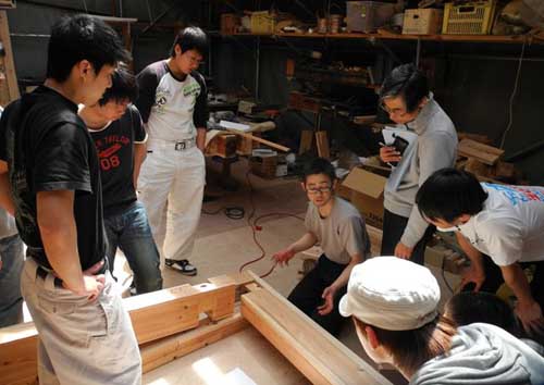 4月23日 渡り顎の見本を前にAチームメンバーに説明するタダ棟梁