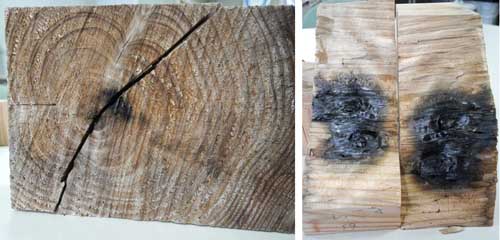 これが木片1です。左の年輪が見える画像で赤身の外側に近い辺りが黒っぽくなっているのがわかるでしょうか。ここからうっすら青い煙がでていて、かなりの熱をもっていました。割ってみれば、右の画像ですが、中はやはり、焦げていました。もわもわとすごい勢いで煙を上げていた木片2の方は?