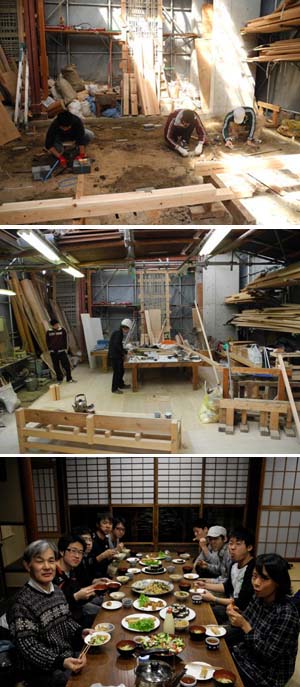 さっそく、打ち上げとなりました。サノ先生の奥さまの手料理をいただきました。これで次のステップに入れます。次は、2年生たちがやっている町家改修現場のお手伝いと、テーブル製作だそうです。道具の手入れもしたいです。