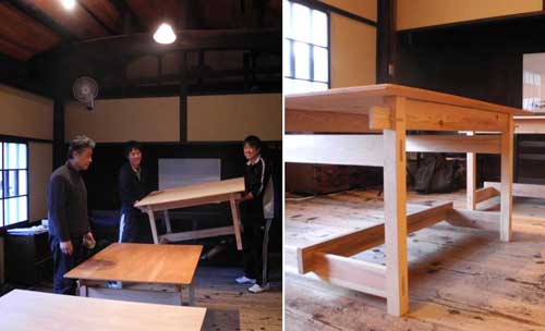 6日、テーブルを納めに参りました。7年前の先輩たちが改修した夷川通りの町家です。2階のギャラリーでイベントを行う際に使うテーブルなんだそうです。普段はたたんでしまっておくので、こういう分解できるテーブルが欲しかったのだと。天板はコンパネで、脚にはダボで留めるだけですが、寸法をきちんと取って納めてあるので、がたつきもなく、上出来と喜んでいただきました。簡単に分解、組立の仕方を説明した後、奥さまがコーヒーとお菓子をご用意、お茶タイムと歓談のひとときとなりました。この部屋を苦労してつくってくれた先輩たちの話を聞きながら、ちょっとした達成感を味わうことができました。なんかハッピーな気持ちです。 (その内No.3といわれるようになってやる!と思ってるオグリでした)