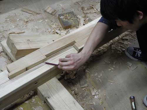 これは4寸角の力垂木を継いでいるところです。今回の設計ではすべての構造材はあらわしで、頭上に見えて来ます。下手なことでは空間に緊張感が出ません。プロの大工でもたいへんなことですが、初めて道具を手にして1年の生徒たちが挑戦を始めました。 1本1本の材木をどう配置するか、どう見せるか、皆で意見を出し合い、墨を確認しながらの作業です。とにかく、愛情をもって木に接して欲しいと教えています。