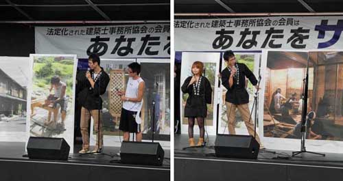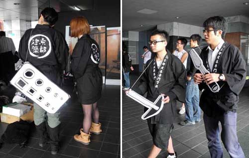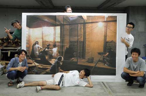 ステージは広い半屋外の場所なので、プロジェクターも使えない。町家改修などの活動を一般の人たちに話すには、どうしても絵がいる。そこで、ベニア板に写真をいっぱいに伸ばして貼付け、みんなで持って並ぼうということにした。学校を紹介する画像を集め、3分割してA1用紙に印刷し、貼り合わせた。中には6枚を合わせたもの、9枚を合わせたものなど、合計ベニア11枚のパネルが出来上がった。夜遅くまで制作にあたってくれたみんなありがとう!