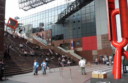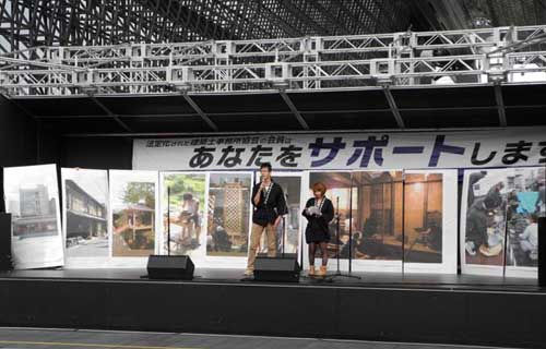 さあ、当日、京都駅の大階段の途中にある室町小路広場です。とっても大きな空間!ここは風がつよくて、看板は大丈夫かな?出番が来て、みんなで看板を運ぶ姿はまるで熱帯にいるハキリアリが葉を担いで行列をつくっているみたいでした。しっかり持っていないと、風で飛ばされそうになります。