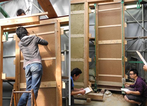 通常の伝統土壁よりもやわらかで軽いものをつくってみようと、フォレストボードという杉皮のリサイクルでできた断熱材をほどいてスサに混ぜてみようという実験です。うまくいくかどうか、試しにサンプルピースをつくろうということになりました。