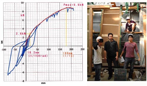 サノ: データをグラフにしてみますと、やわらかなカーブの曲線となっていますね。5段の貫が効いていて、急にがくんと耐力を失うということはないように思われました。軽くて自然素材でできている断熱材がこの程度の耐力があるというのは、とてもありがたいことです。やわらかい素材なので、壊れ方もやさしく、決して人に危害を与えないというところがいいです。