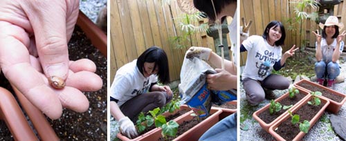 みんなで楽しくプランターに土を入れて、苗と種を植えます。