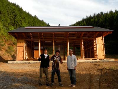 研修棟では、ダブルに入っているすじかいの中央を結ぶ作業を。座屈長さを短くして強度を得るよう、実験で確かめているので、ここでもそうすることにした。1年生の二人に取付作業をしてもらっている間に、付近を散策、森の整備工事を見て歩いた。すこしずつではあるが、手が入って生き生きとして来たところ、自然なしずかさが破られて残念に思われるところ、さまざまである。やがて、強い雨が盛り土を削り流し、元の自然な山に近付けていく。わが管理棟や研修棟はどうなって行くだろうか。