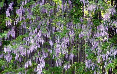 風薫る5月、たしかにそう。この日、朝まで降り続いた雨も上がり、素晴らしい天気に。午後から空いているというタカハシ君とナガセ君を連れて、久しぶりに京北合併記念の森に出かけた。研修棟の入り口付近にある杉木立には、目も覚めるような藤の花が。藤は杉をダメにしてしまう嫌われ者であるが、こんな見事な花を見てしまうと、ちょっと切れない。林家の人もそう思ったにちがいない。風向きで藤の香が届いてくる。