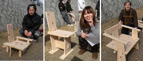 「見た目No.1」は、これも圧倒的にタカアキさんの紐椅子(画像左端)。前評判通り、とても素敵。座りごこちは?でしたが。座をもうちょっと大きくしたらよかったのかな〜?