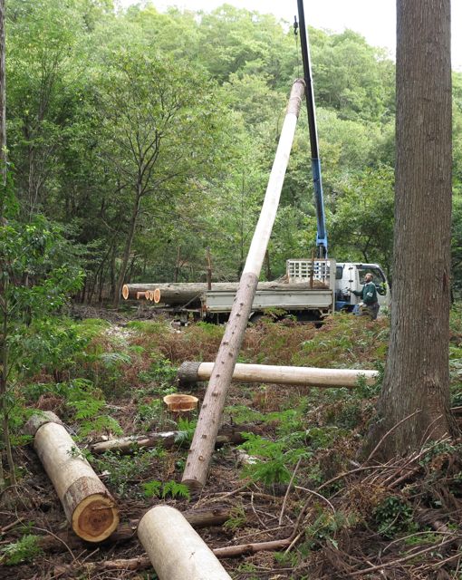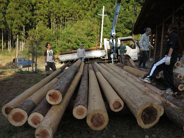10月13日、杉皮を取った太めの杉材をツリーハウスの桁材に使うべく、山から搬出、運搬の作業を行いました。
