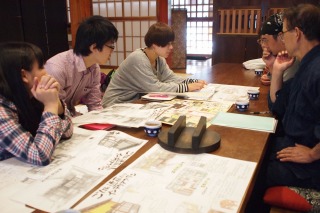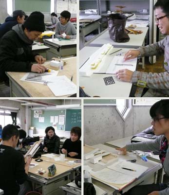 製図室の窓側で10人ほどがウオヤ先生を囲んで、何やらやっています。ひとりひとりの案を模型で説明してもらい、ウオヤ先生がコメントを入れています。ゼミ風景ですね。