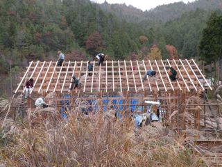 23日、予報では晴れるはずが、相変わらず時雨れていやな天気。でも、雨が上がるたびに屋根に登って垂木を打って行きます。午前中に片面が終わり、午後からもう片面の作業に。僕は見ているだけで、手伝いもできず、それに寒い!悔しいけれども、仕方ないです。