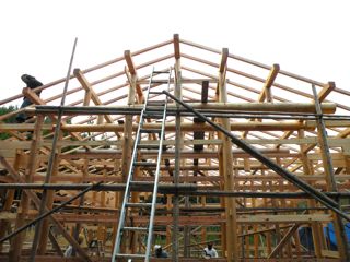 小屋組みの込栓もすべて打ち終えたので、どんどん内部足場を外す作業となりました。足場を除去すると、内部空間が感じられ、嬉しさに包まれてきます。次は越し屋根の垂木とともに、鼻隠し、広小舞、登り淀をつけて野地板の準備をして行く予定です。