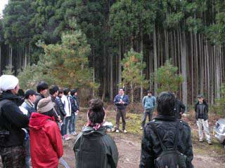 セキ:たくさん人が集まったね。今日は京都林業研究会というところの主催なんですって。カンバツ体験から始まるらしいよ。先ずは京都市の方からご挨拶。ノン、聞いてる?