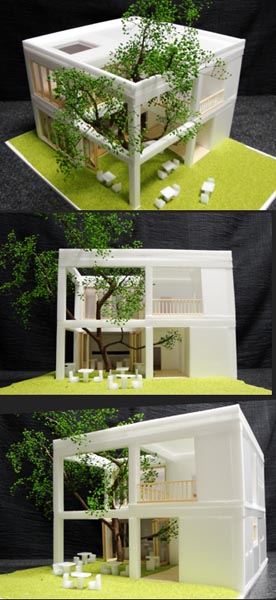教科書に載っている事務所ビルをカフェに改修するという課題に対してつくった作品です。隅のスラブと壁を抜いて、大きな木を植え、建物と自然との共生をテーマにしてみました。
