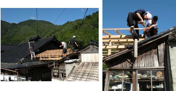材のほとんどは、解体した建物の材を使い回しています。夏の木匠塾では、釘を抜きながら、鉋をかけて苦労したものです。垂木をあらかじめ彫ったところに合わせて留めたところで、雨が。もう少しやりたかったのですが、仕方ない、この辺りでこの日は引き上げました。