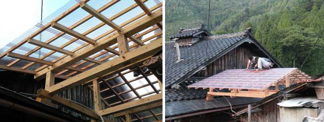 この辺りによくある主屋と納屋との間のにわに、渡る屋根を懸けようというものです。高さの違う屋根に懸けるので、土台に下駄をはかせて調整します。土台に梁を渡り顎で架けて、束を差し込んで