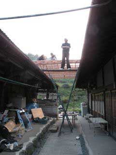 10月1日は素晴らしい晴天!今日は仕上げるぞ!垂木に墨をつけて、小舞を打ちます。しっかりした小舞を留めると、屋根らしくなりました。そこにポリカーボネイトの波板を傘釘で留めて行きますが、これがなかなかたいへん。細い錐で下穴を開けながら留めることに。こんな作業、生まれて初めてだけに、下にいるサノ先生からオコラレてばかりです。