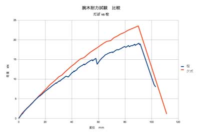 結果をグラフで出してみました。前回の栓(けやき 30*15*360mm 4カ所)よりも優れた結果が見られます。実際の腕木のつくり方として、このダボ方式でいいようですね。見事な試験体の製作をしてくれたTD君に、皆さん拍手!