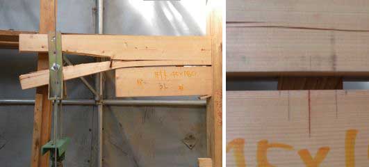 突然、ばっかん!と、すさまじい音で破壊しました。一同、びっくり!何と、載荷点のボルトが、腕木を割ってしまっています。そうか、そこで壊れるんだ。破壊の衝撃で、腕木が肘木よりも9mmほど浮いていて、ダボが隙間から見えています。記録では、23kN、90mmの沈下でした。1mの腕木が9cmも曲がっているのですから、1/11radの変形、しかも曲げ破壊ではなく、引裂せんだん破壊によって壊れています。ひのきの曲げ耐力というのはすごいですね。これで、荷重の掛け方を、腕木の中央に通したボルトで引っ張るのではなく、実際の母屋が押すように、腕木の上端に掛けていたら、もっと高い数字となったはずです。
