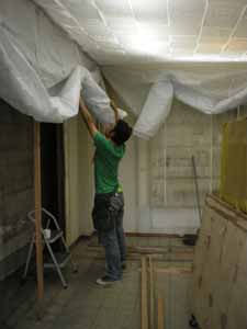 現場にあるもともとの天井枠に、新たな天井枠を設置し、がびょうで少しづつ天井紙を取り付け。考えていたより紙の重さでたるんでしまいましたが、照明をつけてみると、ぼんやりいい雰囲気!!