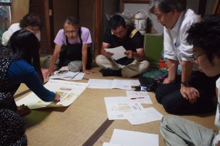 さの:どれどれ?うん、まあまあだね。今年の面は昨年よりも比較的スムーズでよかった。この調子で西側まで回りましょう。実測班はもたもたしているなあ。何でも寸法をとるんじゃなくて、何をつくるか、柱や桁をイメージしながら、制作に必要な寸法を採ればいいんだよ。平面図をスケッチしながら、柱、梁、桁を描き込む。断面図も描いて行こう。