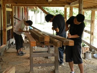 ヤマダです。僕も加わって一緒にがんばってました。写真にも写っています。(この日だけの参加でしたが。)小屋根は2本の土台と、3本の梁・桁、9本の束と14本の垂木からできています。写真は桧の梁材を加工しているところです。土台とは渡り顎で噛み合います。束は長ほぞ+込み栓で留めます。重ねほぞの束をがんばってつくったのに、サノ先生にダメ!作り直し!と言われて、がっかり。言われてみれば、確かにそうだ。小学生にもわかる間違い。どうして気がつかなかったんだろう?