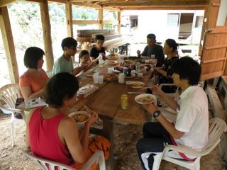 小塩の宿舎にもどって、皆でご飯!この日は掻き揚げ丼と夏野菜の炒め物、みそ汁とご飯。ほかにはキュウリのサラダでした。料理長はオ〜バさん。いっただきま〜す。(おいしかったです)