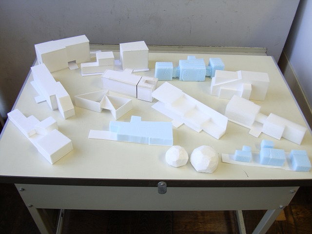 写真はヴォリュームの検討時にみんなが持ち寄った模型の一例です。背が高いの、低いの、丸いの、四角いの、三角なのなどなど色々なものが出揃いました。