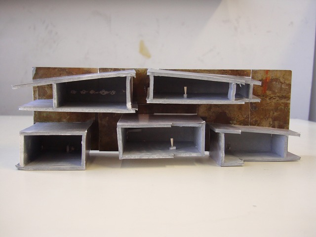 1つ目はマツシマくんの作品彼らしい、レベル差を駆使した建物です。マツシマくんは美術館ではなくギャラリーを設計するとのことで、様々な高さの部屋で毎回違う作品を楽しむといった感じでした。ウオヤ先生もお気に入りの作品でしたが、マツシマくんの気が変わったため、この案はあえなくお蔵入りです。今は外観がガラリと変わってレンガ倉庫案で着々と設計が進んでいます。