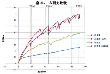 DとFはほぼ同じ強さを示しています。DはEと同じ5段厚貫ですが、込栓で留めている分、動きが拘束され、強度が上がっているものと見られます。