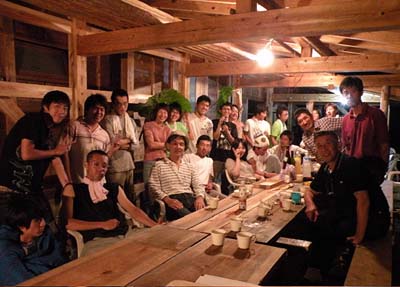 今日は夕方からご近所さんに声をかけて、恒例のパーティをします。皆で手分けして準備に大忙し。今回の小屋制作の元請けでもある京都市林業研究会のメンバーも加わって、とても賑やかです。昨年の木匠塾でできた下屋のお陰で、安心してパーティができました。それにしても、皆さん、よく食べ、よく飲んでくれました。最後に、記念写真。明日から組み立て開始です。
