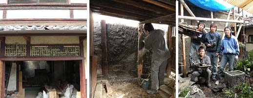階段のあるところは、もともとあったように、外から編みました。夕方近くになってやっと小舞編み完了!サノ先生が来て、検査!OKが出て、荒壁塗り!メグさんも参加です。4枚分の壁を1時間程で塗りましたが、肩や手が結構疲れます。先生は15分で塗れと言うけど、初めてでは無理!(プロは一日に20枚ほども塗るらしい。)途中から、サイ取りという役目を担当しました。長い柄のついたフォークみたいな道具に土を取り、塗り手のコテ板めがけて土を突き投げます。案外、面白い!何か充実の一日でした! (コバ、テラ、クリ、メグ!)