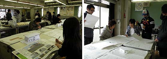 2月17日、1年生の終了設計「美術館」の最終提出日。めいめいがすべての図面とプレゼンテーションや模型を公開、皆で採点し合います。敷地は鴨川沿いと高台寺付近の小公園の2か所から選びます。図面は配置図、平面図、立面、断面、かなばかり図のほか、構造図を課しています。採点はこれらの図面がしっかり描けているか、計画や意匠の魅力を評価します。
