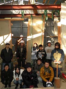予想通り、初期剛性はさほど高くないけれども、変形性能はそこそこ認めていいようです。データを整理すると、壁倍率としては1.4倍と出ました。(ばらつきを無視、終局耐力で決定)。これでABCすべての実験が終わりました。全員で記念写真です。