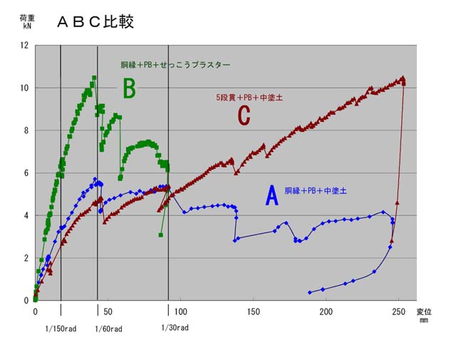 同じフレームで、同じ石膏ボードを用いて、下地、土塗りの種類が違うことで、グラフにあるような個性的な違いが出ています。AとBは石膏プラスターと中塗土の違い、AとCは胴縁と貫の違いです。壁倍率計算法で規定されている壁倍率は計算に当たって、ほぼ1/60rad 程度の変形までしか考慮していないようですので、それよりも大きな変形が考慮されていません。実験では、1/30rad から先がどう耐えるのか、どう壊れるのかを注目していますから、1/30rad で突然壊れた石こうプラスター塗りのBなどは、大地震の際には実際には具合が悪そうだと思われます。どこまで変形してもどんどん耐えていってくれる貫工法のCなどがやはり一番信頼がおけそうな気がしました。