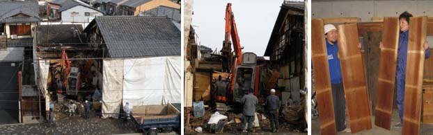 1月21日、せめて建具などを譲っていただきたいと、解体業者さんに掛け合い、いくつかいただくことができました。現在、学生たちで改修工事をしている東寺町家に使えそうなものもあります。レナ坊からも、天井板が欲しいと言われ、ジョー、ミウラ君を連れて天井をはがしに。ネズミのフンを頭からかぶりながら、何とか必要な枚数を確保。町家を残すことはできませんでしたが、せめてもの部品をほかの町家に生かすことだけはできそうです。