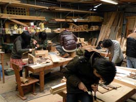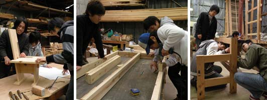 クリ坊です。後期の木工授業は精度をあげようと、家具の製作をやっています。まずは風呂の腰掛をつくりましたが、それに続いて、学校に置く椅子とベンチ、ベランダのスノコを製作することにしました。僕は大工志望グループ5名とともに大きなベンチに挑戦します。さの先生の標準的な図面をもとに、作業場に残っている材木に合わせて寸法を見直し、部材を挽き割り、プレーナーで調整します。必要な部材が揃うまでがたいへんだということがわかりました。