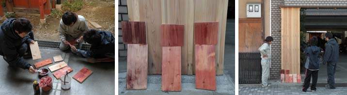 さて、がんばって作ってきた校門も大工仕事はすべて終了、いよいよ最終段階に来ました。白木のままがいいなあと思うのですが、1年でずいぶん日に焼けて黒くなってしまっています。先日からペーパーをかけて元の白い肌にしていますが、このままではまたすぐに黒く汚れてしまうので、当初の計画通り、ベンガラを塗ろうということになりました。まずは見本塗りです。柿渋のみのもの、ベンガラを薄く柿渋で溶いたもの、それに墨を注したもの、桐油で上掛けしたものなど、サンプル塗をしました。