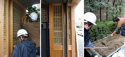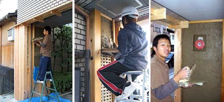 さて、塗るぞ。ジュン、もっと裏に土を込めてやらんとあかんらしいぞ。サノ先生、厚さはどのくらい?木舞のかぶりを7~8mmくらいにするって。ジュン、厚すぎ!下にこぼし過ぎ!先生、この非常ベルのとこ、タイヘン。え?オレならできるって?そう言われりゃそうだ、ほかの誰がこんなのできるって。まかせろ。...いつもなんかこんな風にノせられてやっているような気がする...。細いコテ無いの?竹のへらでやれって?これ、オレの作品だよな。もう暗くなって来たよ。あ、今日はオレの誕生日だっていうのに。先生、タコヤキ20個! (今日から20歳のコーダイ!)