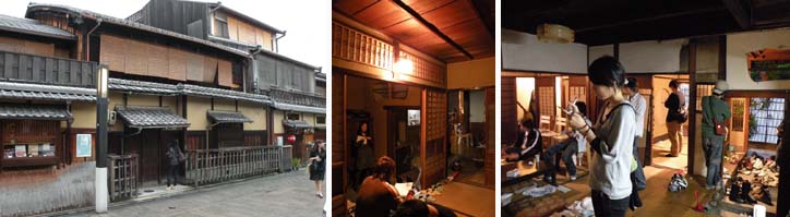 ユースケです。町家ゼミで祇園かいわい、花見小路の元お茶屋さんに見学に行ってきました。今まで見学に行った町家はこの学校の先輩たちが改修したお住まいが多かったのですが、今回の町家はこれから改修を計画しているものです。小雨のぱらつく寒い夕暮れ時ですが、花見小路はさすがに一大観光名所、人が多い。目指す町家はどっしりと落ち着いていい風情でした。