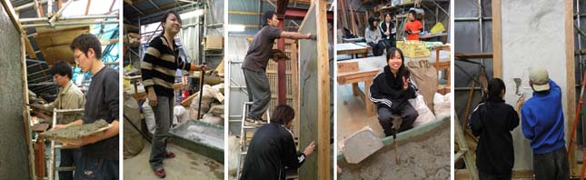 この日は下地塗り用のモルタルを薄く塗って、やや落ち着いた頃合に土や石膏プラスターを15mmの厚さになるように塗りました。