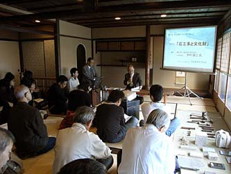 中に入ると、使われなかった時間が長かったのか、ちょっと荒れた感じがしました。平面は御茶屋らしく、小さな座敷があるかと思えば、どんと大きな座敷もあり、全体として、細やかな意匠が施されているというよりも、おおらかで媚びるところのないどっしりとした印象に、歴史を感じました。2階へ上る階段が広くゆったりとしていて、広い立派な廊下があります。ここで一差、舞を疲労するのでしょうね。座敷の欄間が東山を象ったこれもおおらかな透かし彫りとなっています。奥には前栽(中庭)をはさんで2階建ての離れ座敷になっていて、そこに渡る廊下がいい風情です。真ん中に生活サービス部分があり、隠れた階段などがあって、サービス動線ができています。さの先生の説明後、学生たちめいめいで平面を取る演習をしました。なかなか複雑な間取りになっていて、たいへんです。