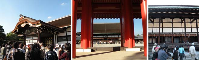 今日は三上校長先生がご都合悪く、代わりにサノ先生が説明してくださいました。私たちだけでなく、一般の人たちも説明を聞きに集まって来るので、回りは人の山!その度に宮内庁の係員から注意を受けてしまいます。今の紫宸殿は1855年の建造とか。明治維新に先立って、御所の新築をしているんですね。とても立派な建物ですが、楚々としていて、威圧感いっぱい、という雰囲気ではありません。周囲を取り囲む朱塗りの回廊や門もこれ以上ないくらいすっきりとしたデザインで、さすがに日本を代表する建築なんだと感心しました。