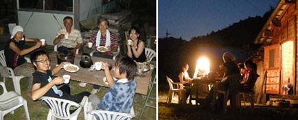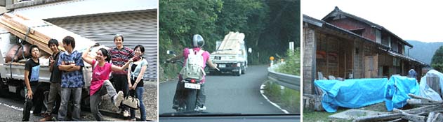 小塩に着いて木材を降ろし、家の中を一度ダニ退治の薬を焚きます。シュラフを干し、夕飯の用意。夕食はめぐさんが料理長で、リゾットを。京の料理店からいただいた鶏スープを用いたリゾット、白ワインも効かせて、まずまずの出来でした。ちょうど明日の下小屋のために用いる足場丸太を三間さんが届けてきてくれましたので、一緒に戸外で夕食会です。日中は暑かった小塩も、日が沈むと涼しい風が吹いて、とても気持ちがいいす。京都の地獄のような熱っぽい暑さとは別世界!さあ、明日から木匠塾前半の部、本番です。みなさん、よろしく!(1年リーダー スケタでした)